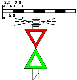 ![]() Stange mit Toppzeichen: Toppzeichen: rote quadratische Tafeln (die Seiten waagerecht und senkrecht) mit weissen waagerechten Streifen am oberen und unteren Rand. Kann bei Nacht mit rotem Taktfeuer beleuchtet sein. |