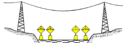 ![]() B) Radarreflektoren werden auf gelben Tonnen montiert und an beiden Ufern paarweise ausgelegt. Auf dem Radarbild ergeben sich je zwei nebeneinander liegende Punkte zur Erkennung der Linie der Freileitung. |