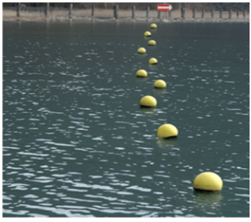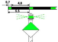 ![]() B) Radarreflektoren werden auf gelben Tonnen montiert und an beiden Ufern paarweise ausgelegt. Auf dem Radarbild ergeben sich je zwei nebeneinander liegende Punkte zur Erkennung der Linie der Freileitung. |