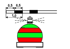 ![]() Stange mit Toppzeichen: Toppzeichen: rote quadratische Tafeln (die Seiten waagerecht und senkrecht) mit weissen waagerechten Streifen am oberen und unteren Rand. Kann bei Nacht mit rotem Taktfeuer beleuchtet sein. |